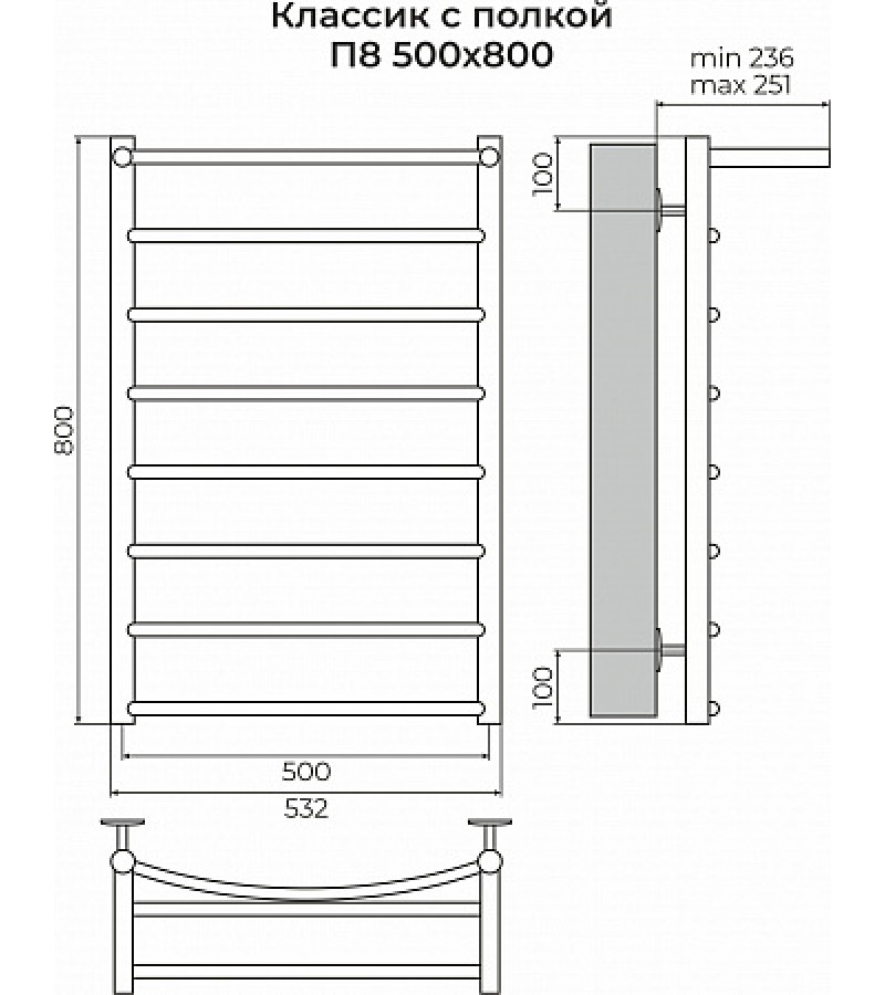 პირსახოცის ცენტრალური გათბობის საშრობი წარმოადგენს მაღალტექნოლოგიურ და გამძლე გადაწყვეტილებას თქვენი სახლის გათბობისთვის. ვერცხლისფერი მოდელი Классик П8 წარმოადგენს საშრობს ზომით 500х800 მმ. აქვს თარო რაც დამატებითი პირსახოცის საკიდს წარმოადგენს.