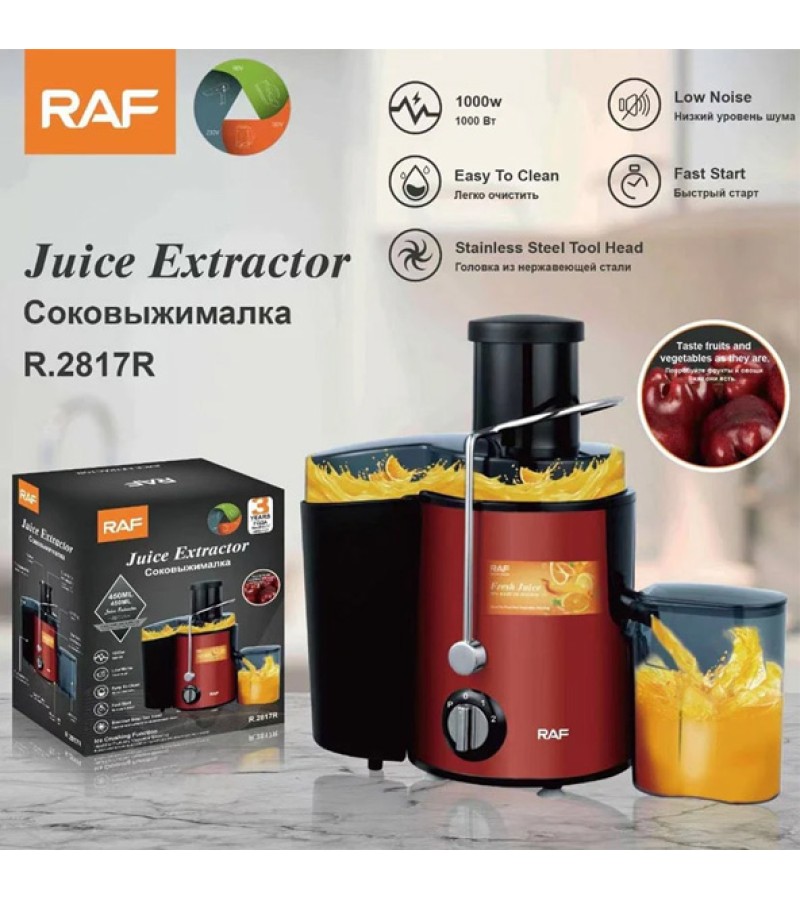 RAF R.2817R მრავალფუნქციური წვენსაწური, 3 სიჩქარიანი, 1000 ვატით. დიდი ზომის ღარში ეტევა მთლიანი ხილი და ბოსტნეული, ასე რომ თქვენ შეგიძლიათ გამოტოვოთ ხილისა და ბოსტნეულის წინასწარი დაჭრის შრომატევადი ეტაპი. სანამ ამ წვენსაწურით წვენს გამოწურავთ. ეს წვენსაწური 7 სპირალური დაწურვით უზრუნველყოფს მაქსიმალურ წვენის გამომუშავებას, მინიმალურ დაჟანგვას და ინარჩუნებს ყველაზე მეტ საკვებ ნივთიერებას.